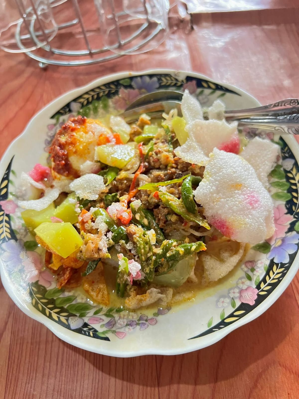 lontong sayur dengan lauk mie,sambal kentang,telur dan kerupuk